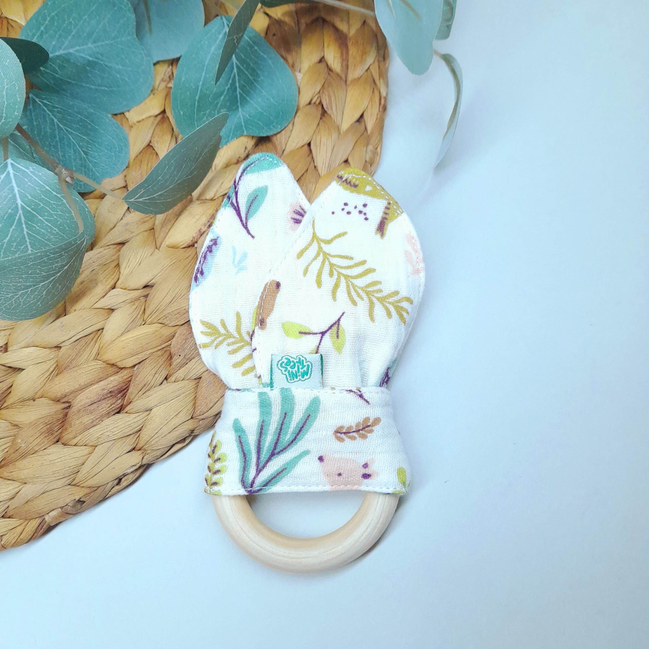Ο κρίκος οδοντοφυΐας “Baby animals” συνδυάζει έναν κρίκο από φυσικό, ελαφρύ ξύλο σφενδάμου με ομοιόμορφο φινίρισμα και ένα αφαιρούμενο πανάκι από 100% βαμβακερή μουσελίνα, με πιστοποίηση Oeko-Tex Standard 100.