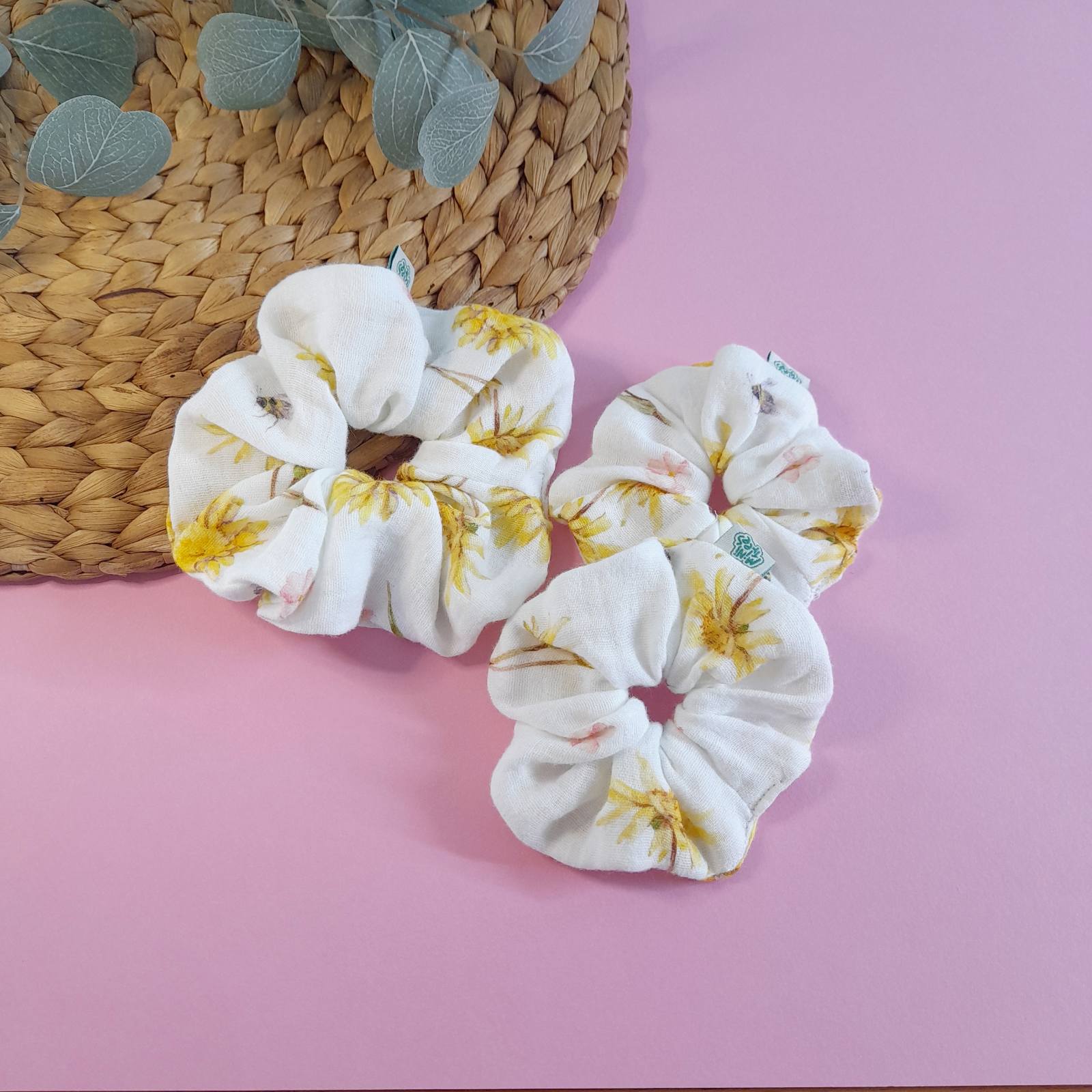 Το χειροποίητο σετ 3 scrunchies “Scrunchies combo Sunflowers” είναι φτιαγμένο από απαλή μουσελίνα 100% βαμβάκι, ελεγμένο και πιστοποιημένο για βλαβερές ουσίες σύμφωνα με το Oeko-Tex Standard 100.